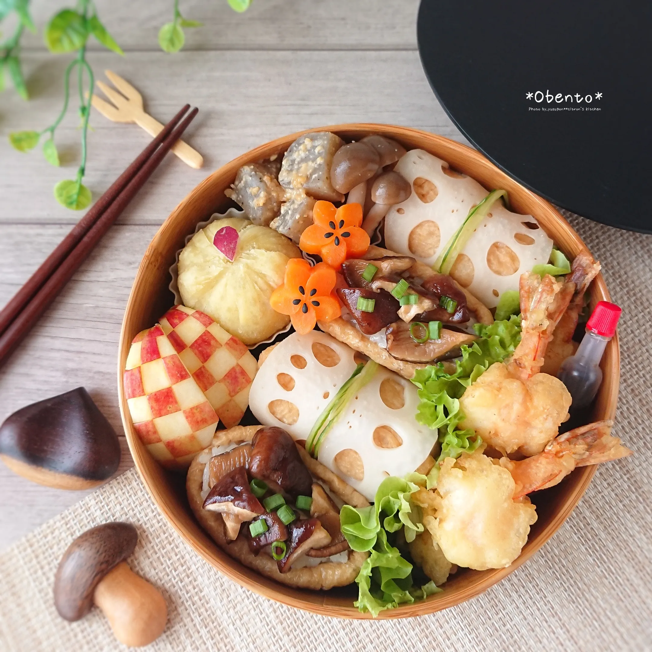 #お弁当 #いなり寿司 #椎茸いなり #まんまる海老天 #さつまいも #紅はるか #絹しょうゆ