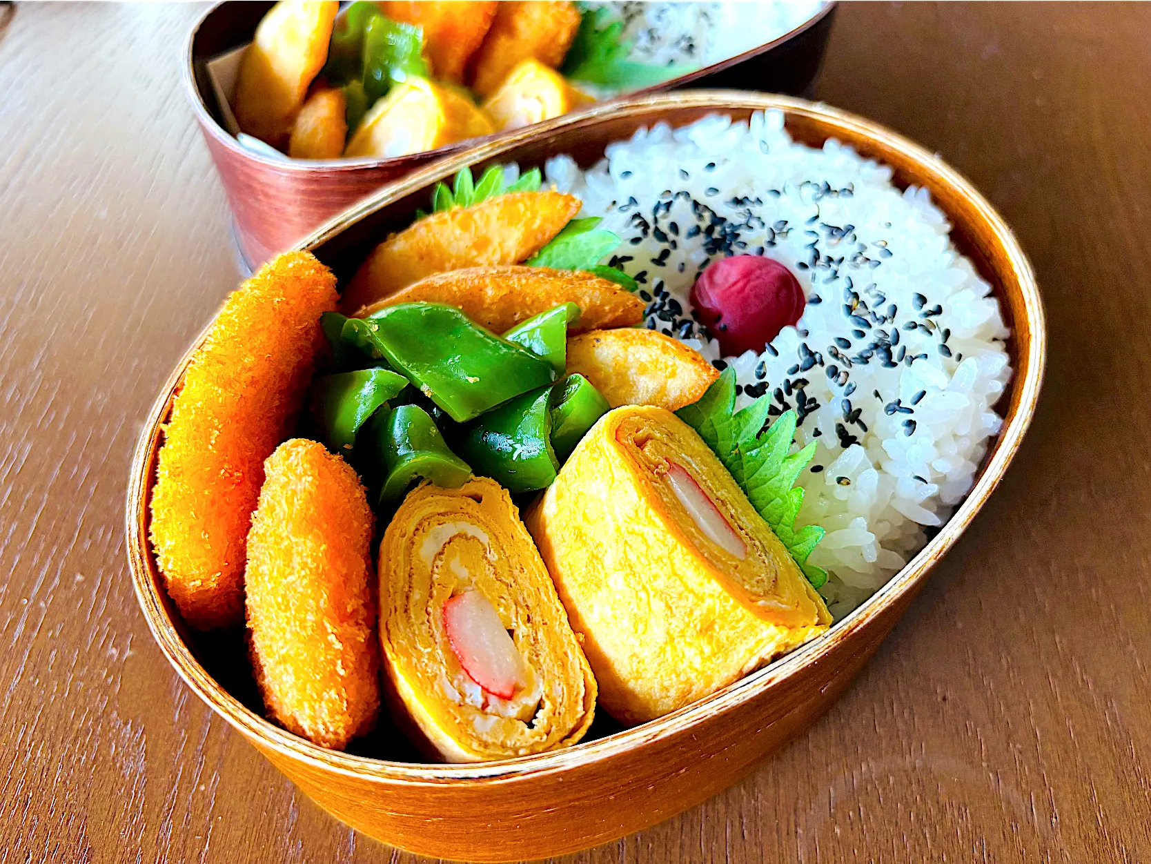 #カニカマ入り玉子焼き #ピーマンのオイスター炒め #フライドポテト #自家製梅干し #お弁当 #曲げわっぱ弁当箱 #わっぱ弁当 #曲げわっぱ