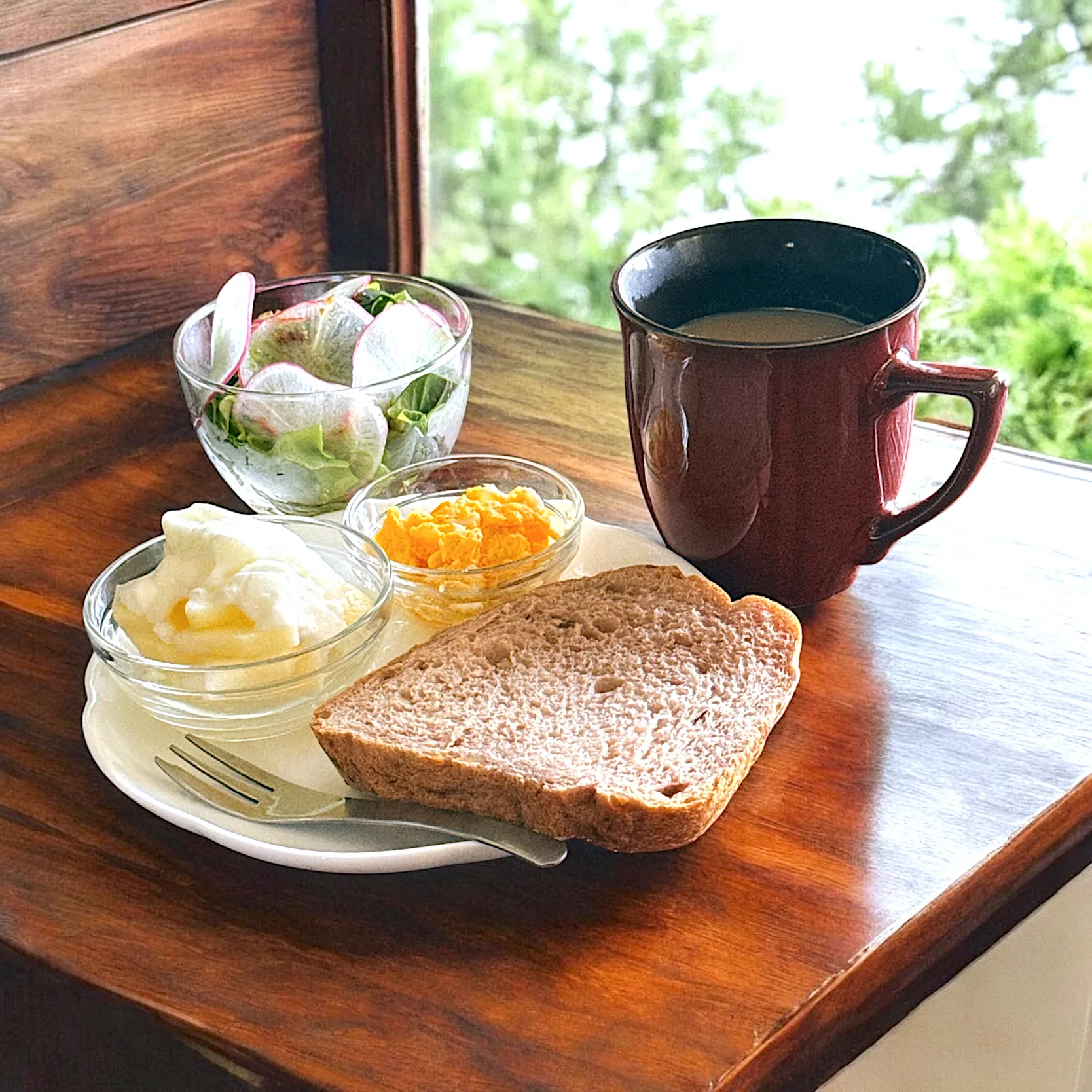 サラダは、赤大根のレディーサラダ、サラダホウレン草、ブーケレタス、和風ドレッシング。