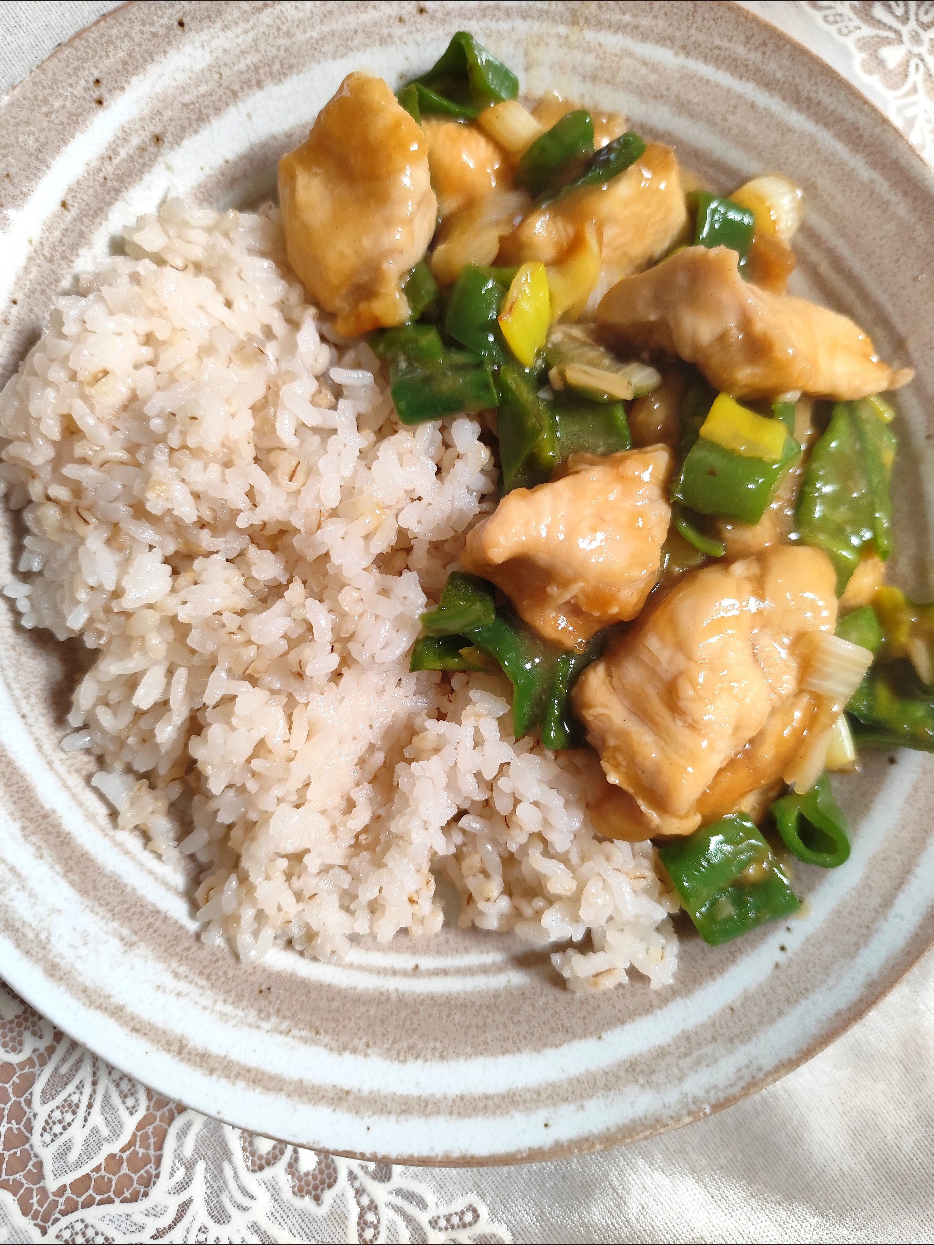 鶏胸肉のタンパク質もしっかり摂れて、何より、御父様作のピーマン🫑が嬉しい😆