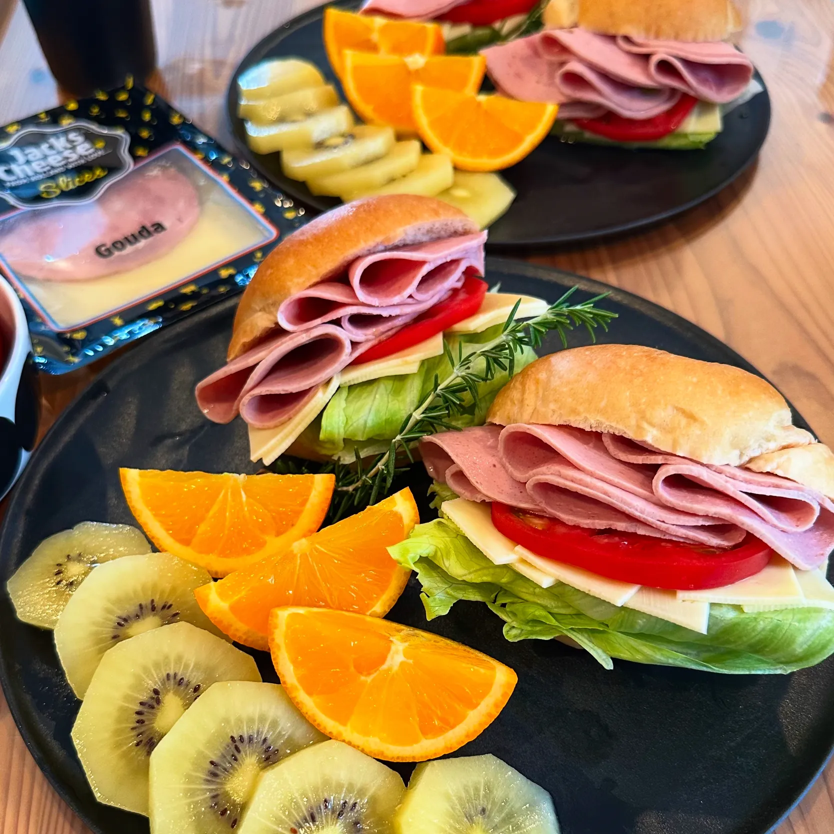 主人公ジャックススライスゴーダに小串トマトをスライスしてハーブソルトを振り、ヤークトヴルストとレタスを添えて。