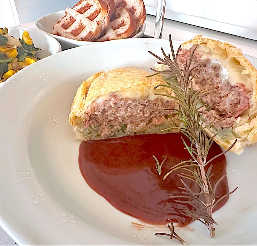 スマホの調子が悪かったのか、しばらく投稿できませんでしたが、今日試しにやってみたら出来たので久々の登場です。今日は冷凍パイシートと湯煎で出来るデミグラスハンバーグを使ってディナー!マッシュポテトに青のり混ぜてその上にハンバーグ、チーズ。パイで包み焼きにしました。付属のデミグラスソースは赤ワインを追加して煮込み、ソースをグレードアップ?!レストラン並みにとはいかないけど簡単にオシャレに。