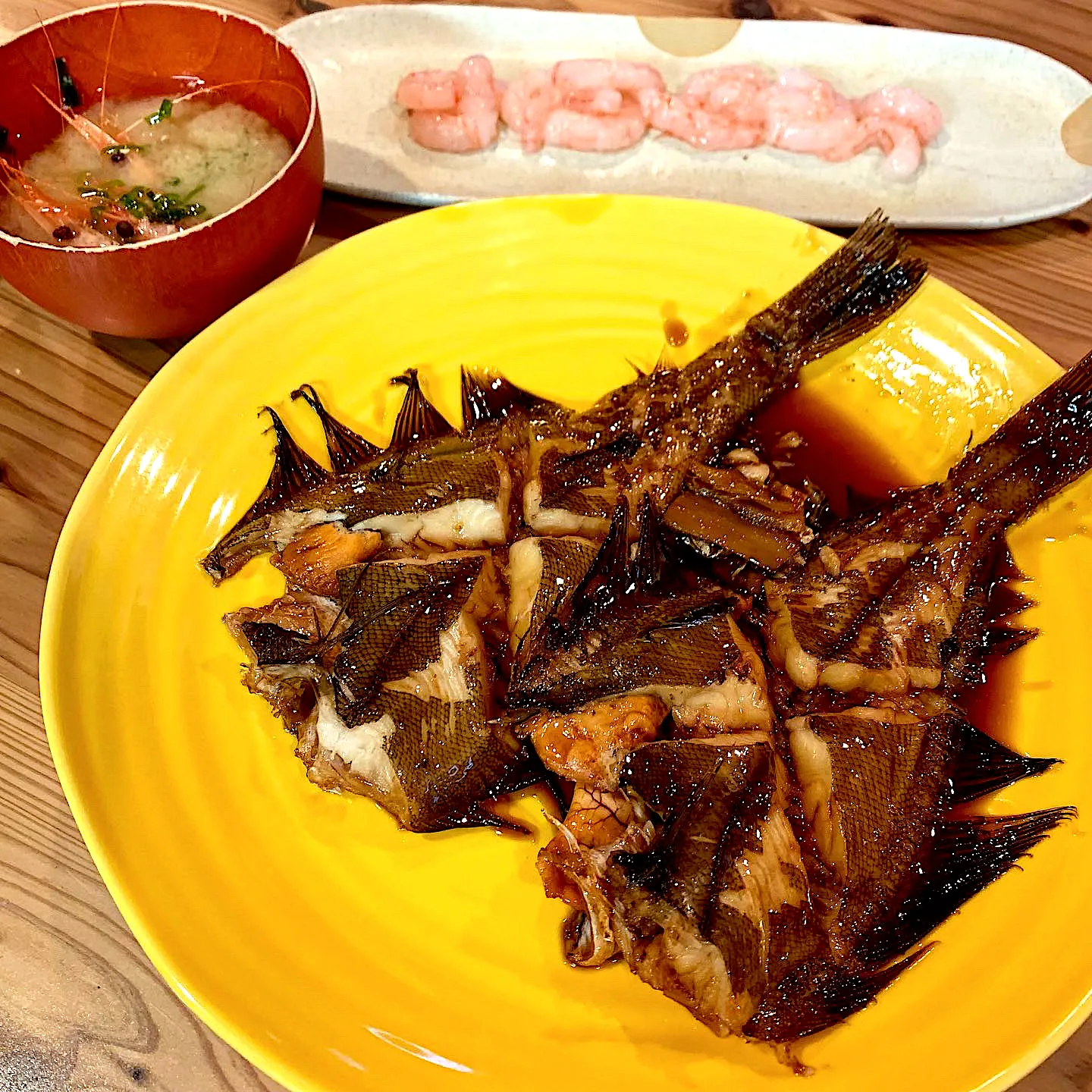 かれいの煮付け 海老のお刺身 海老頭のお味噌汁