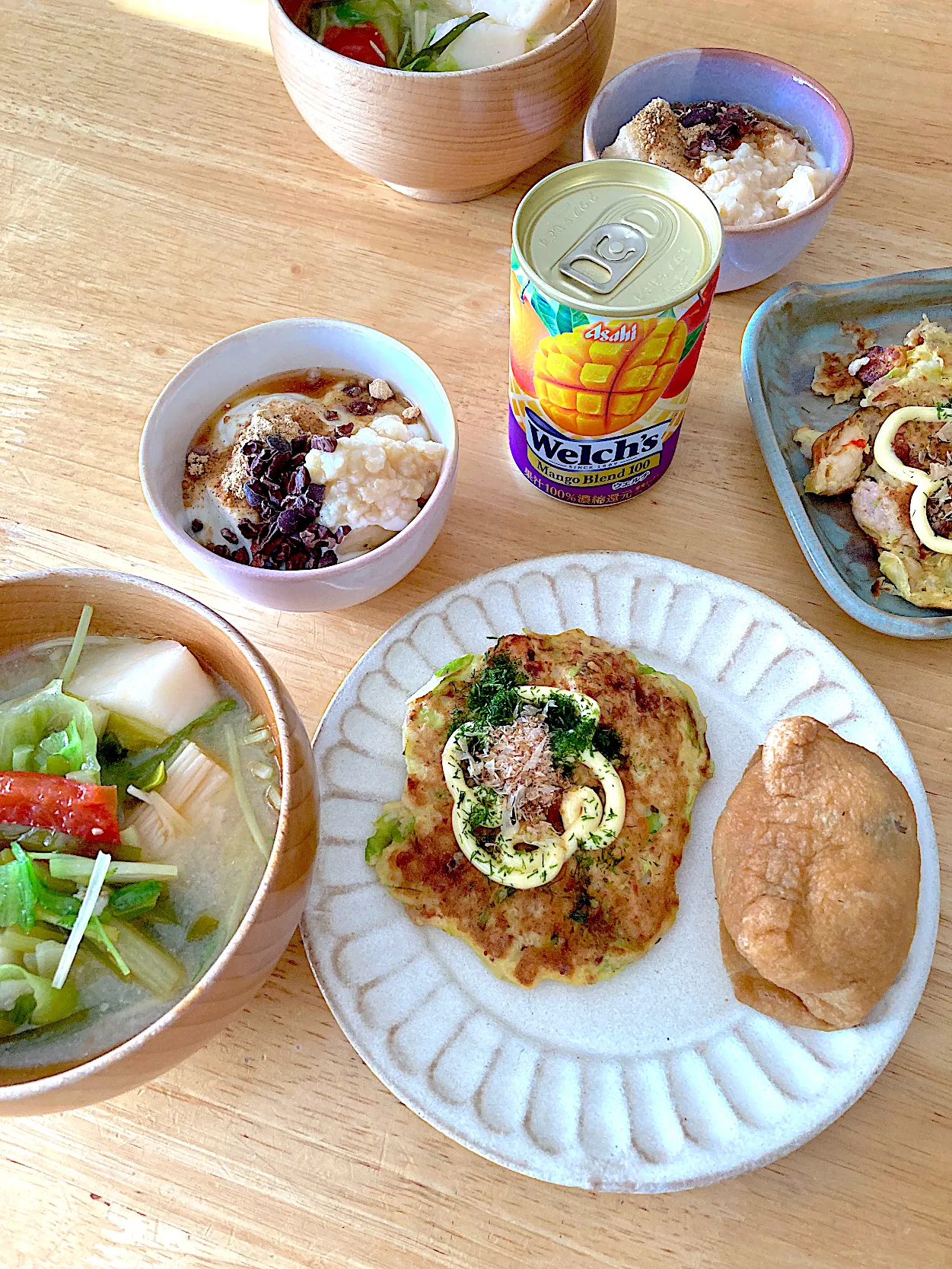 エビと豚のミニお好み焼き♡五目いなり♡ハンペンとお野菜たっぷりお味噌汁♡バナナ豆乳グルト雑穀きな粉おうち玄米甘酒メープルシロップ♡Welchsアップルマンゴー