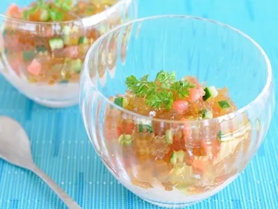 ふんわりサーモン風味のムースとあっさりコンソメ味のクラッシュゼリーの相性が抜群!サーモンムースに「ヤマサ鮮度の一滴特選しょうゆ」を入れる事でコクのある味わいに仕上がります。キラキラとしたゼリーが華やかでおもてなしにもピッタリです。