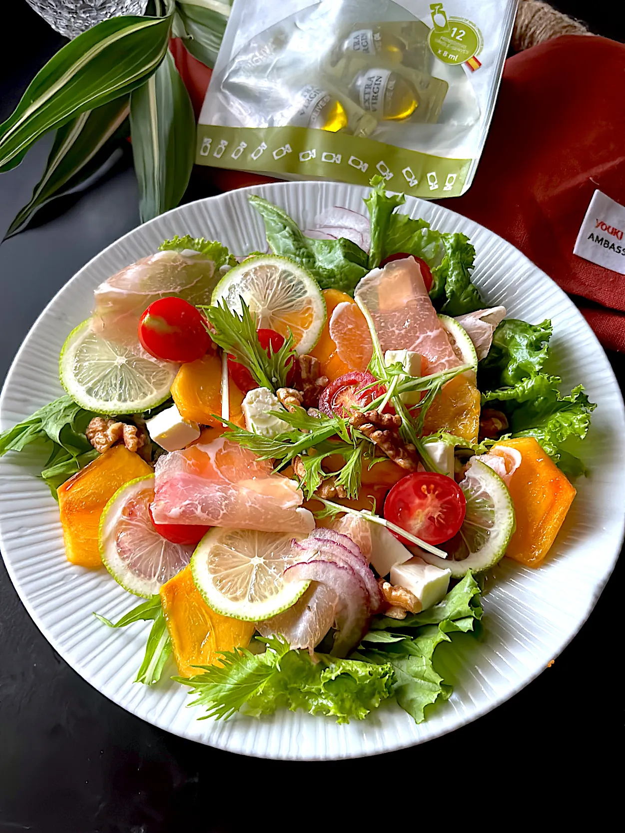 柿の甘味に生ハムやチーズの塩気、そしてクセも穏やかでフレッシュな風味をいつでも楽しめるミニオリーバ🫒で、サラダもグンと華やぎますね⸜(*ˊᗜˋ*)⸝💕