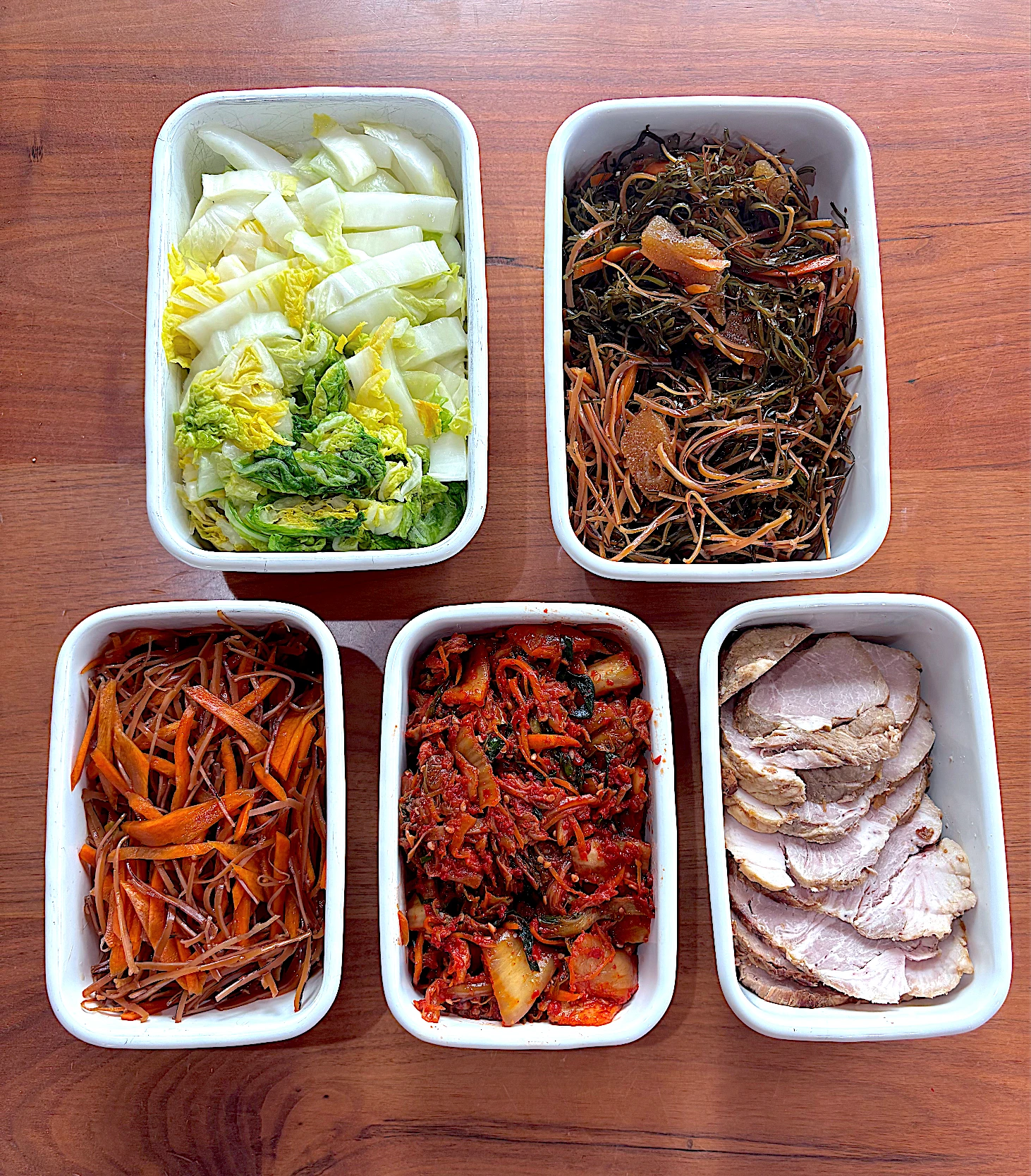 左から白菜の漬物、松前漬け、いかにんじん、キムチ、焼き豚✨全部手作りで、美味しい❤️毎年、本当、ありがとうございます✨