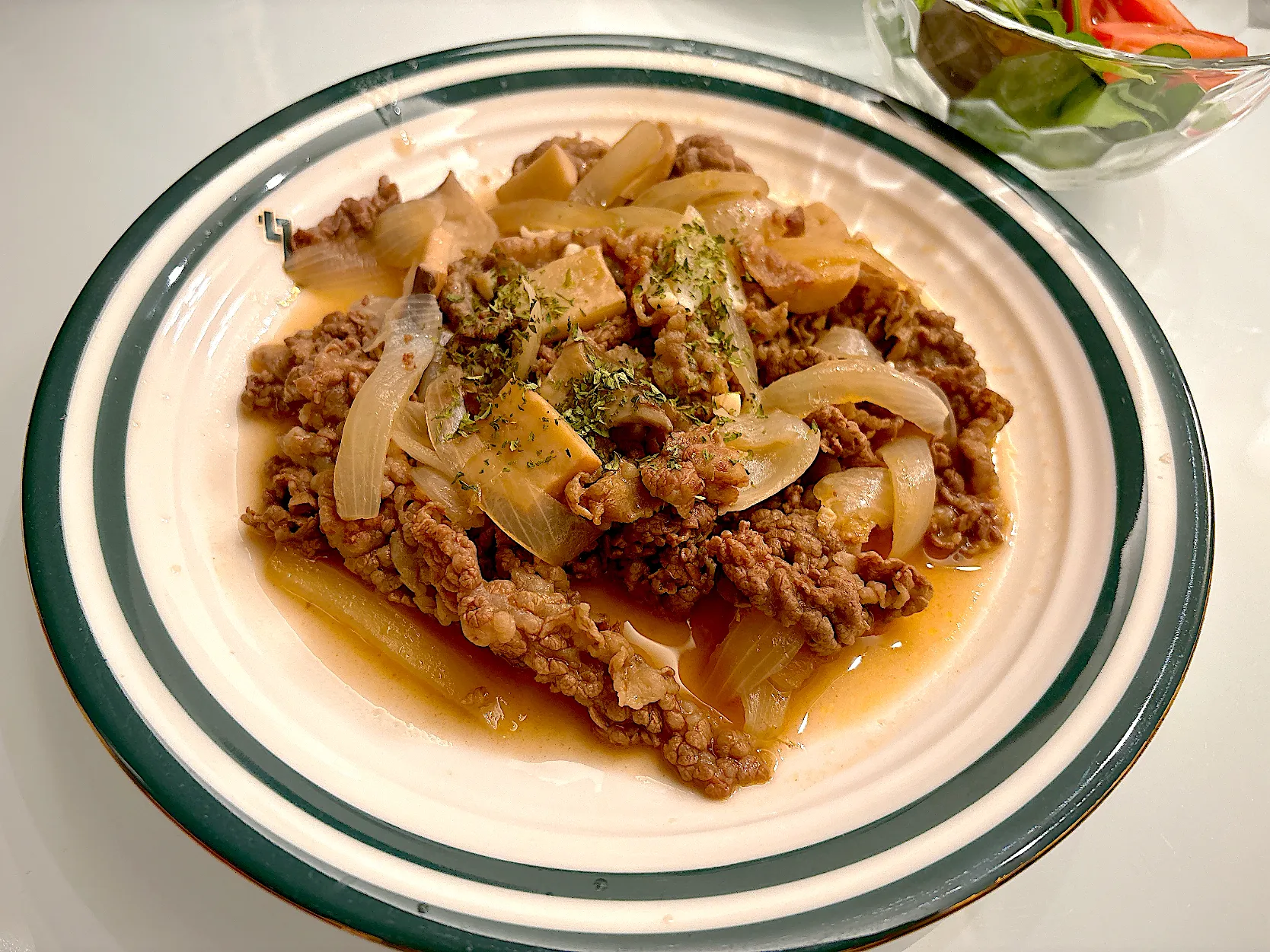 牛肉の色が変わってきたら、玉ねぎ、エリンギを加えて炒める