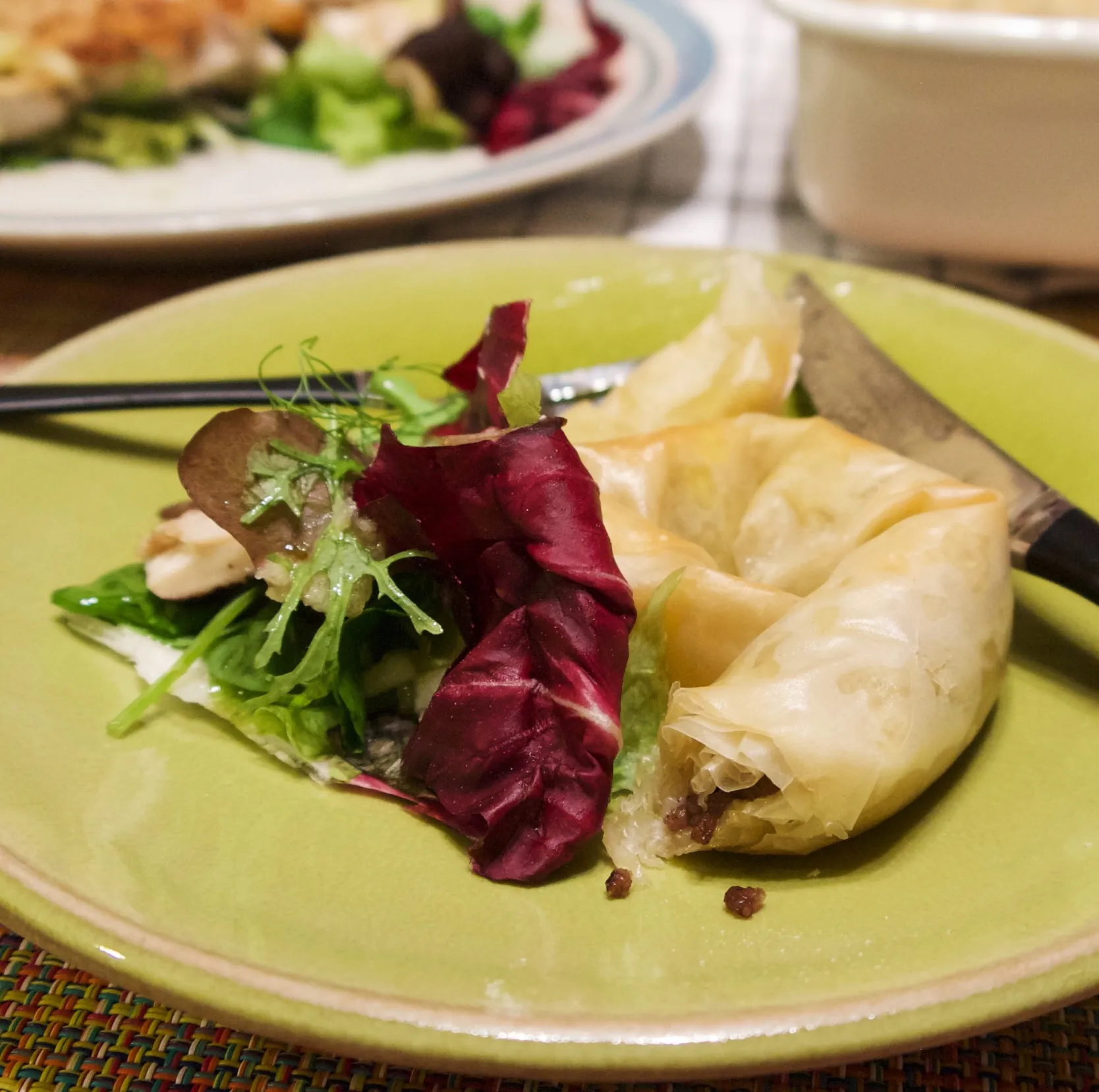 焼きナスを潰したペーストとクミン風味のミンチをグルグルっとカタツムリ状に巻いてオーブンでパリッと。