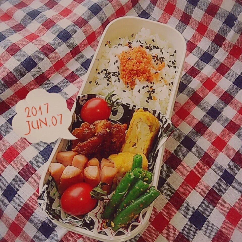 唐揚げ、卵焼き、ウィンナー、インゲンごま和え、プチトマト、鮭ごはん