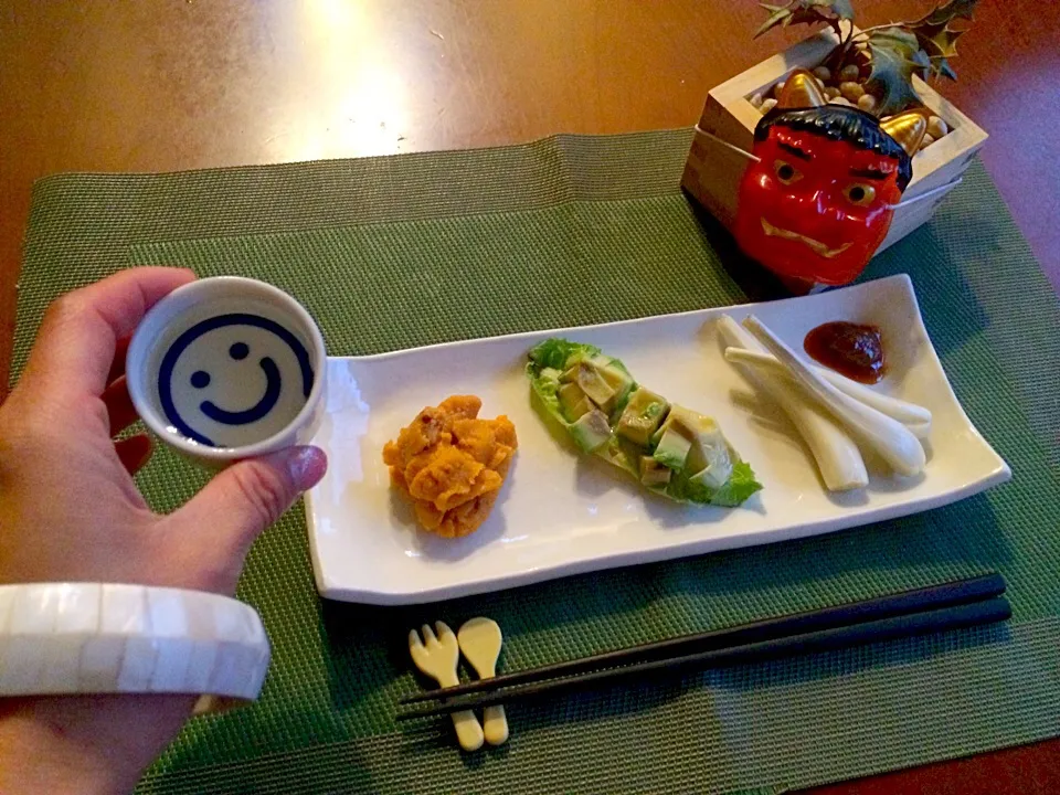 とろける雲丹ちゃん、濃厚ピリッとアボカド、辛味のエシャロットでちびりちびり🍶ヽ(´∀`)ノチビ〜ズのバカ笑いBGMに寒がりワンと暖を取り合って1人酒....騒がしいけど癒されるw乾杯〜🎵