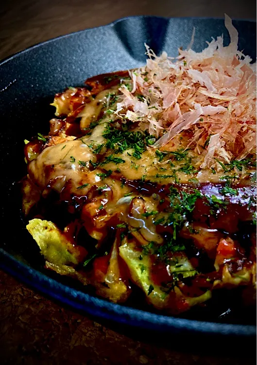 本日お好み焼きが食べたくなって海老、イカ、貝柱、豚のミックスお好み焼きを作りました‼️‼️‼️‼️お好み焼きとご飯🍚は普通に食べれますが皆さんは食べれますか?笑