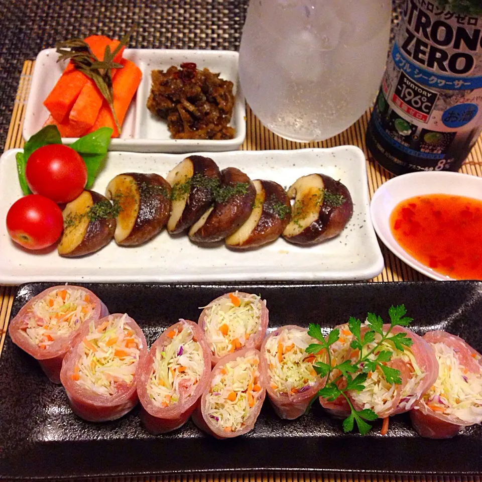 帰ってきてお腹空いたので、チョー手抜きオツマミ!!カット野菜と生ハムの生春巻き!椎茸のペペロンチーノ風味!人参ピクルス!ゴーヤ佃煮!で乾杯!、 #showchu #家居酒屋 #宅呑 #手抜料理 #ストロングゼロ