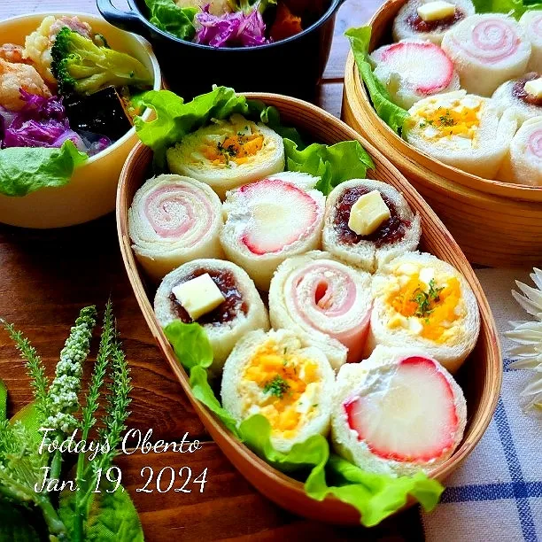 長女弁当💕 ロールサンド弁当✨ ✾ロールサンド  卵、ハムチーズ、苺ホイップ、あんバタ ✾チューリップ唐揚げ ✾ポテサラ ✾紫キャベツマリネ ✾かぼちゃ甘煮 ぐちゃぐちゃ😂