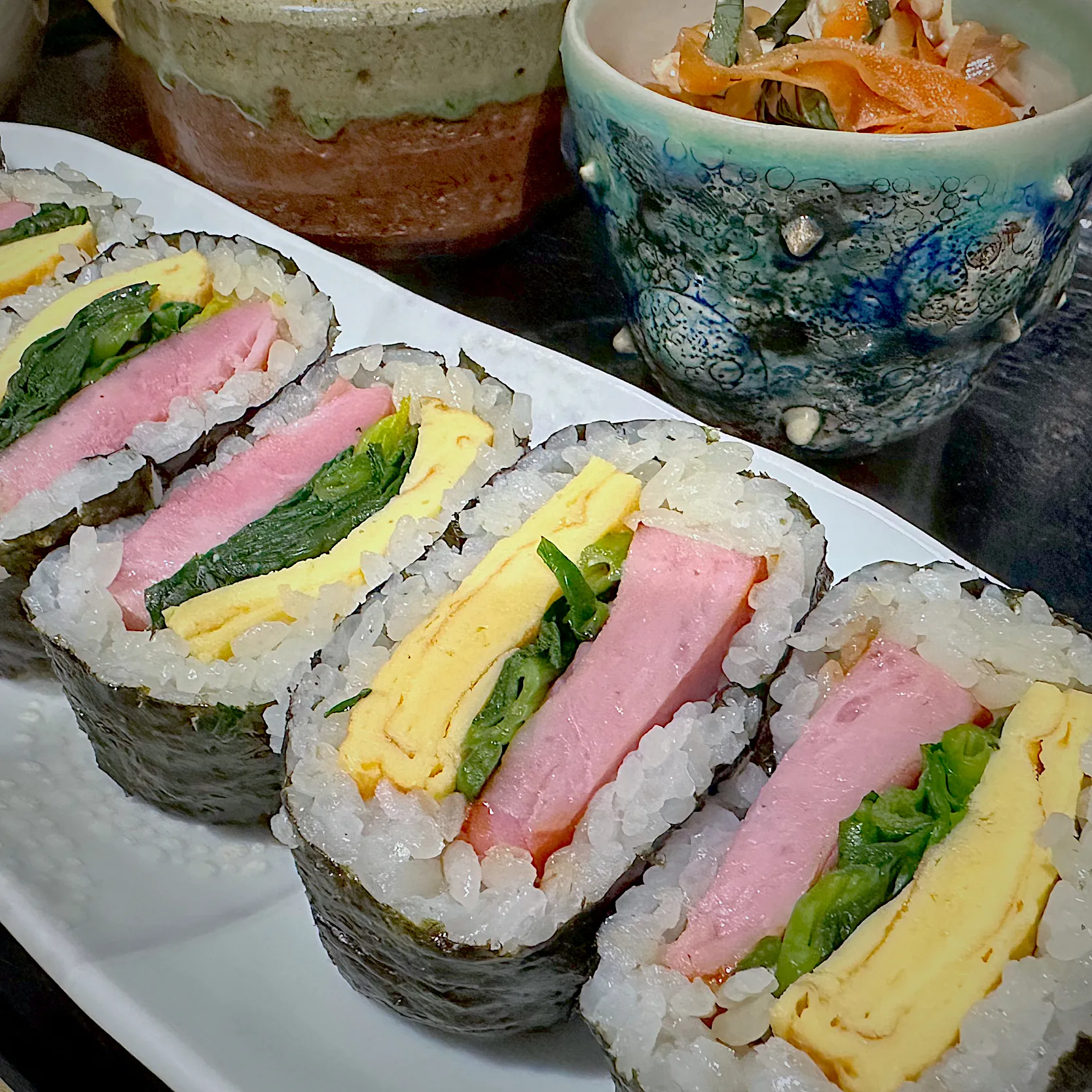 お茶碗1杯分のご飯やけど、結構な量出来たで。卵とベーコン、ほうれん草を3つに切った焼き海苔でパタンパタンと三つ折りにして。今日のキーワードは3?