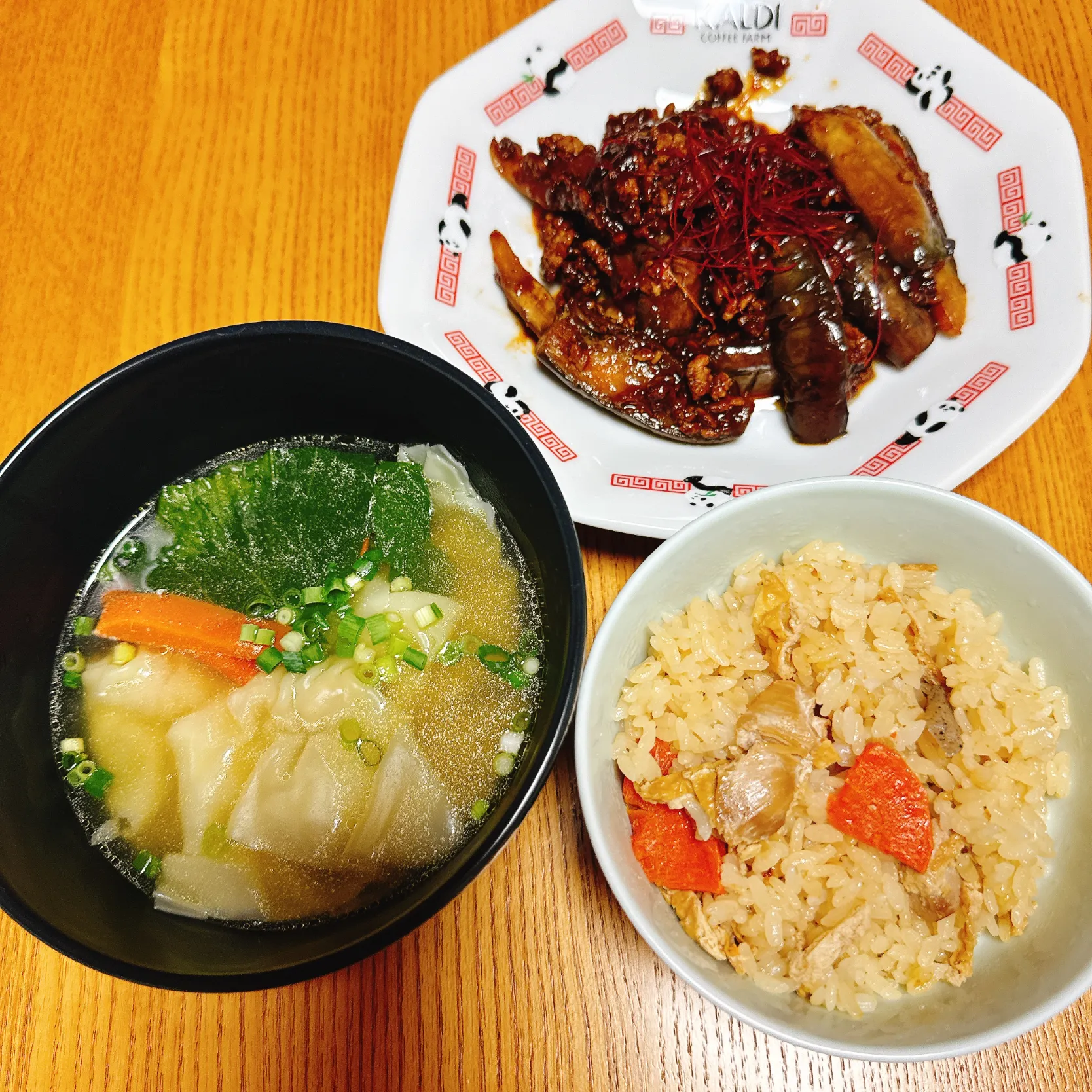 マーボ茄子 ワンタンスープ 炊き込みごはん(鶏めし)