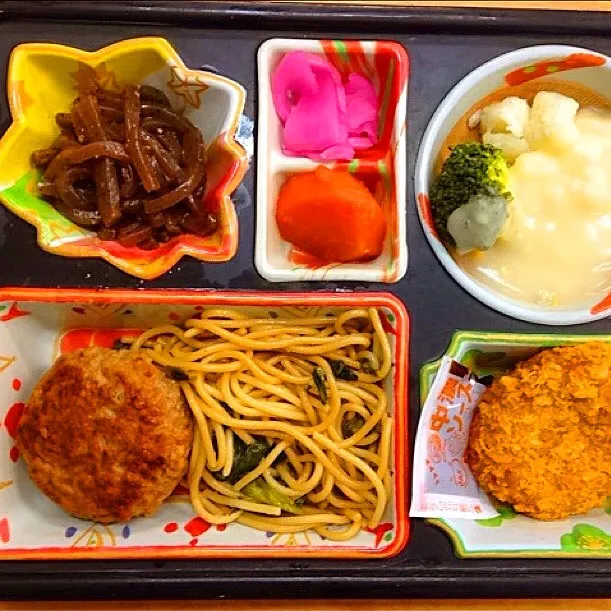 マヨネーズ入り照焼ハンバーグ、菜の花和風パスタ、ポテトクリーム、こんにゃくのニンニク醤油、美味しかった\(^o^)/