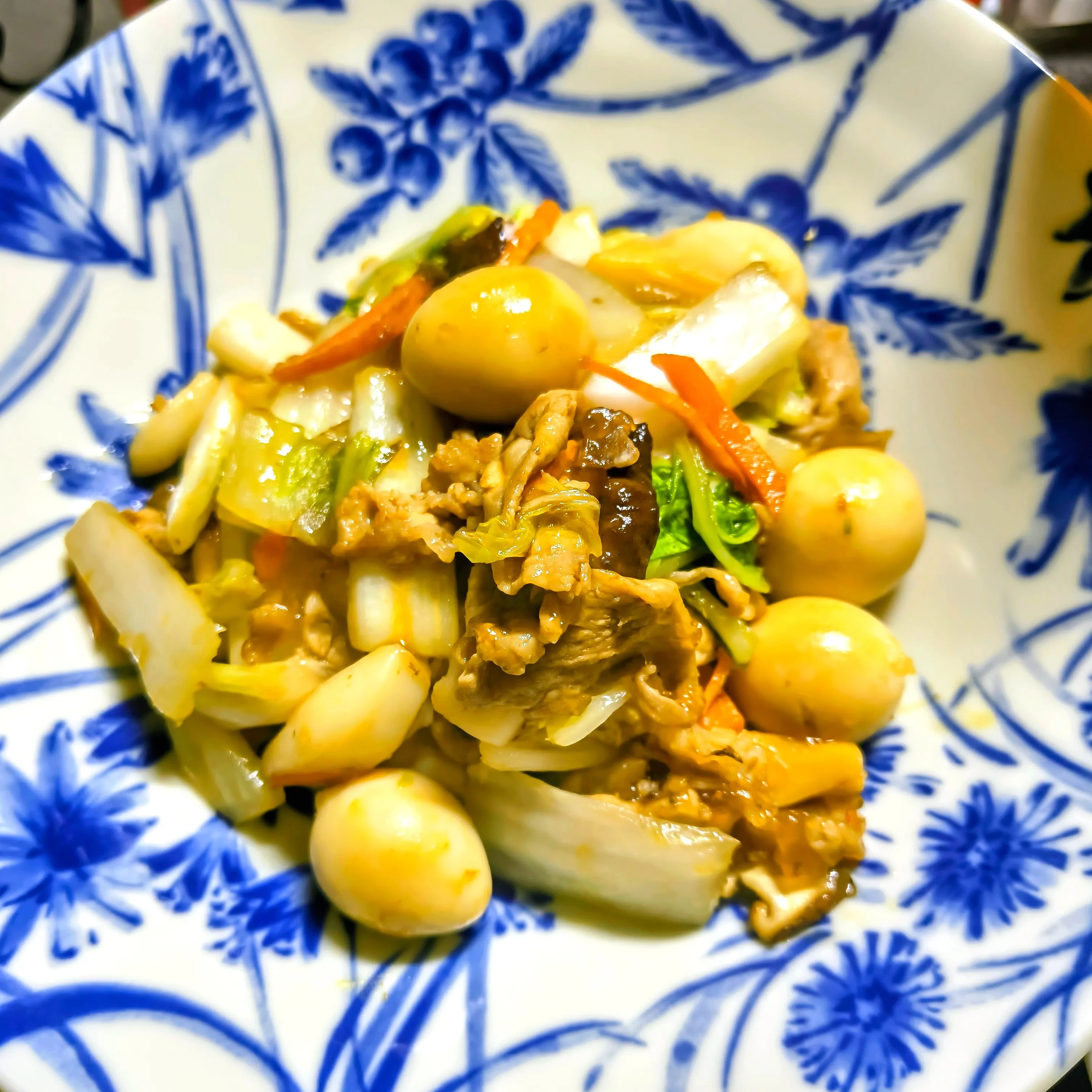 ウズラの卵をなんとなく買ってしまったので八宝菜を作りました。豚コマ100㌘。オイスターソースなどで味付けしました。🌼🌸