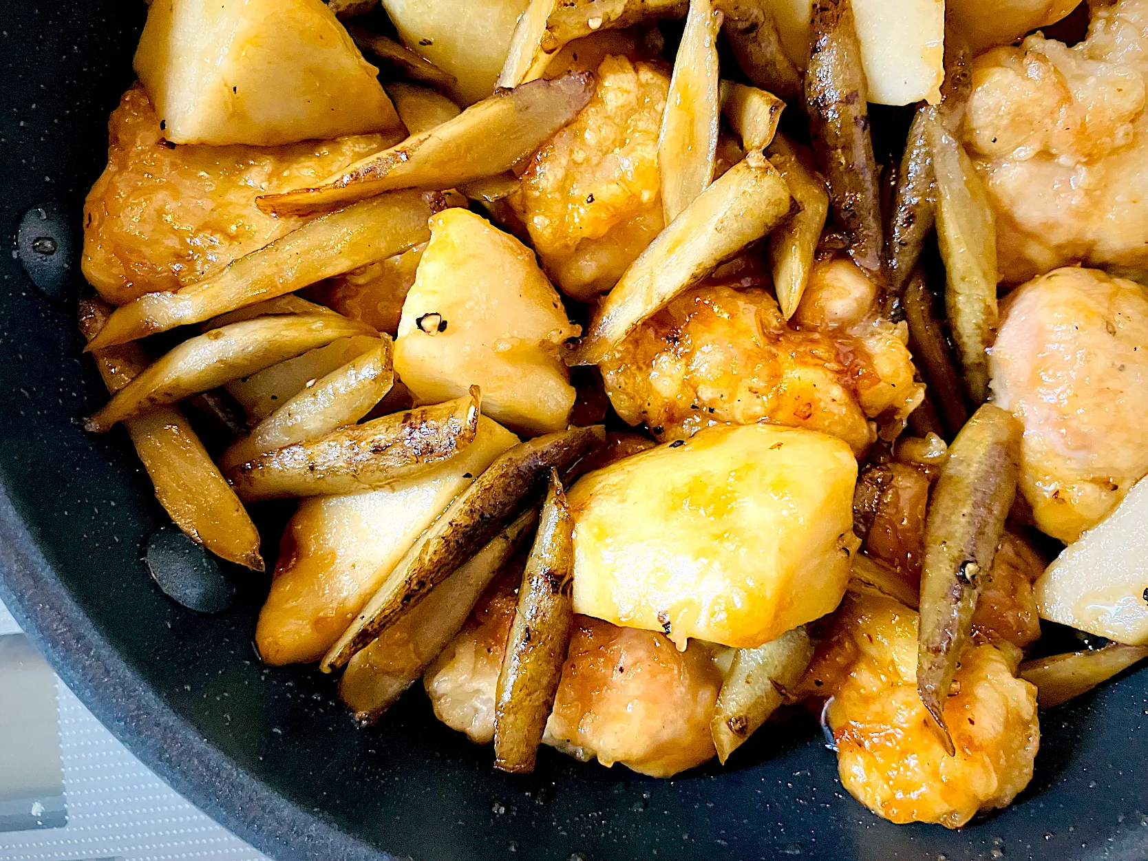 鶏もも250g、細いごぼうと大きめの里芋2ヶ。材料はレシピよりやや多め、調味料はレシピ通り+αにんにく醤油・甘酢の残りを少しずつ。