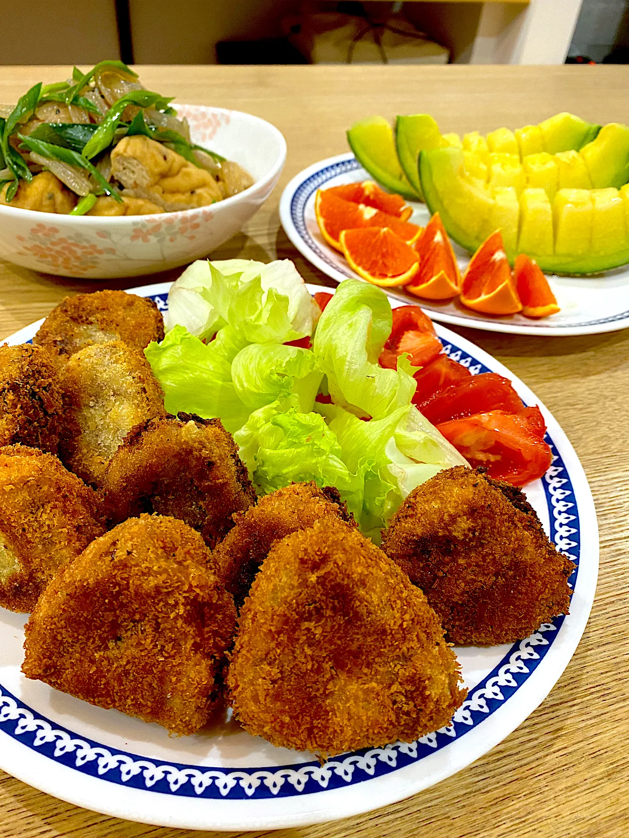 ネットで調べるとコロッケに甘栗を入れたものとあったので、じゃがいも、玉ねぎ、ひき肉、甘栗でタネを作りました。