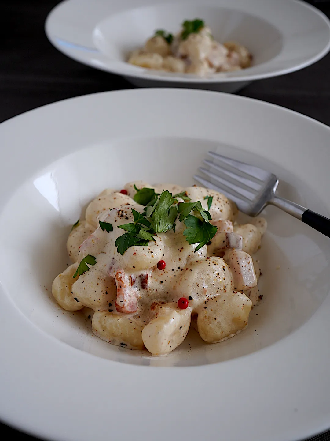 ニョッキは茹でるのも2分と短時間。お湯を沸かす横でベーコン炒めて、ケスクレームと牛乳でソースができちゃう。なんといっても、クリームチーズを牛乳で伸ばすだけ(レシピより多めに牛乳入れました)
