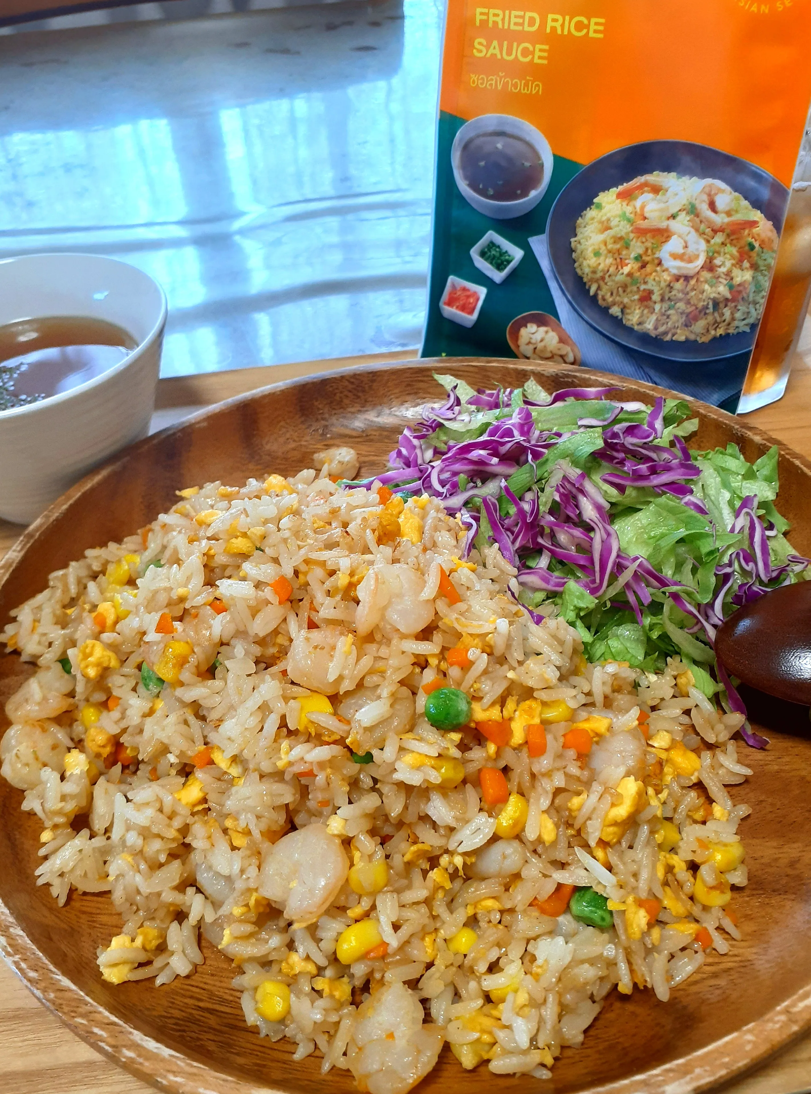 先日ユウキ食品様に頂いた賞品の中にタイ風チャーハンの素あったので前に買っていたジャスミン米もあって冷凍のミックスベジタブルと一緒に炒めたよ~😘