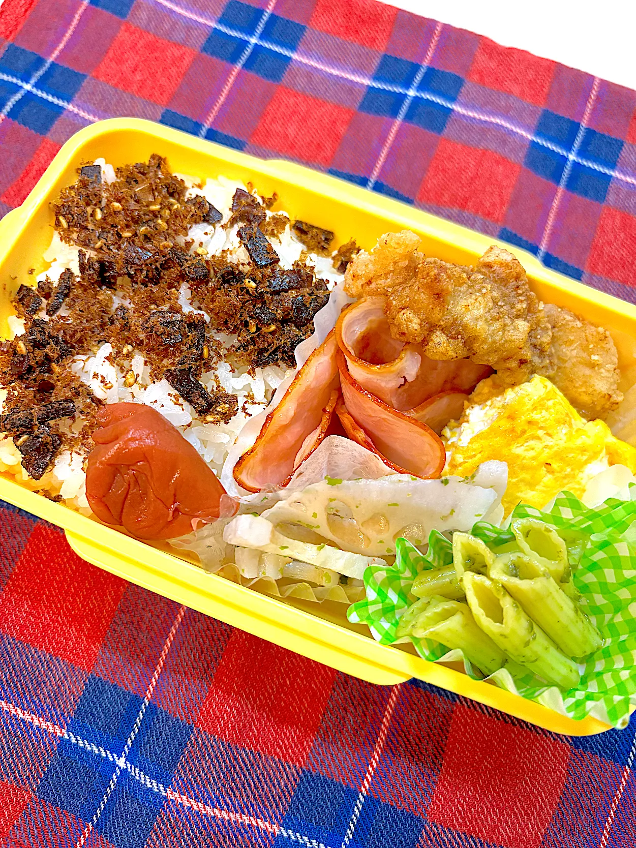 #お弁当記録 #娘 #お弁当 #今日も頑張って! #高校生#テスト期間#れんこんのり塩#マカロニジェノベーゼ#唐揚げ