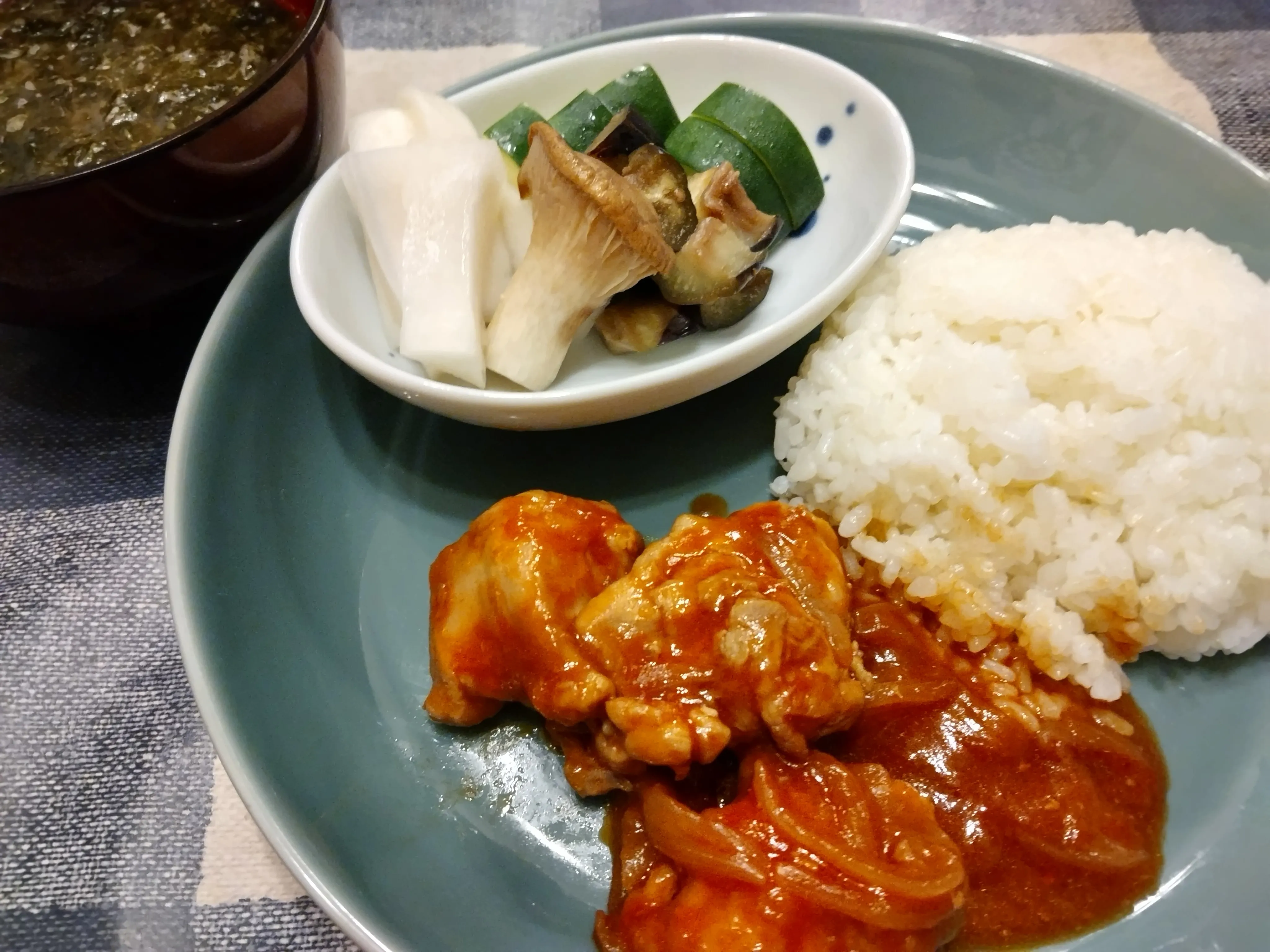 チキンチャッププレート/サラダの代わりにぬか漬け(ズッキーニ/大根/茄子/エリンギ)アオサ入り味噌汁😽