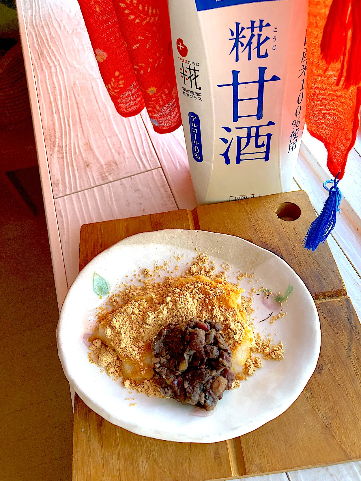レシピでは糀みつ、なるものをかけて食べるとありました。はて🤔初めて聞いた。美味しそう。でも、ないから黒糖で黒蜜を作ってかけようかと思ったけれどあったかいと おもちもどき が溶けそうだなぁと思い直し、乳酸菌きな粉をそのままかけて、黒胡麻発酵あんこをトッピングしました!