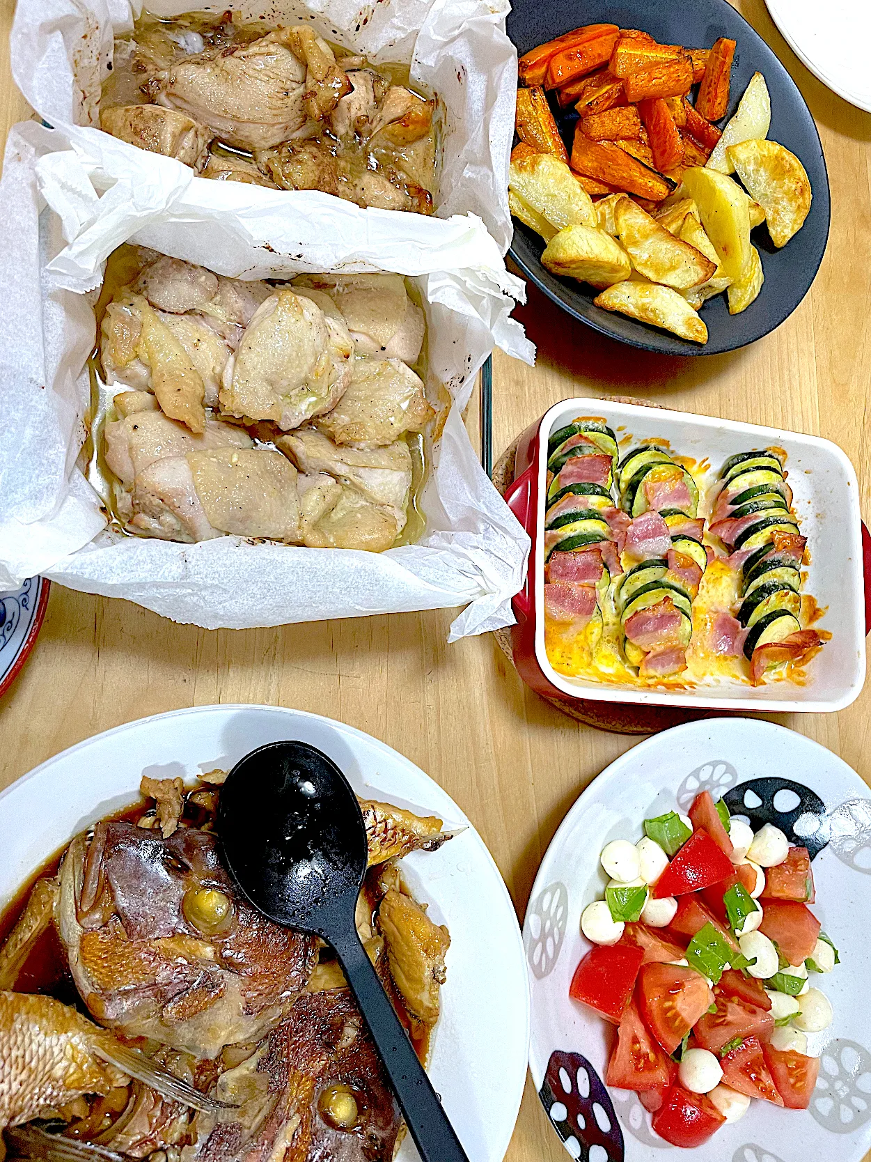 #鯛 #アラ煮 #カプレーゼ #ズッキーニ #鶏モモ #グリル #台風