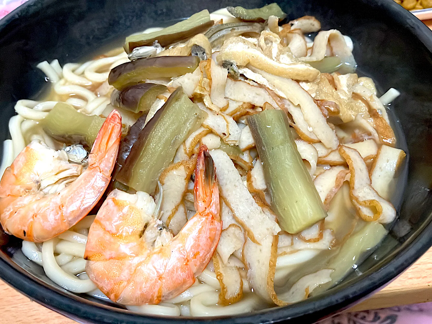 #地産地消 #地元の食材 #簡単料理 #節約料理 #無料食材 #旬の食材 #郷土料理 #日の出新味料#長なす#じゃこ天#イリコ#バナメイエビ#地元発祥のこしなし丸麺うどん#5分クッキング