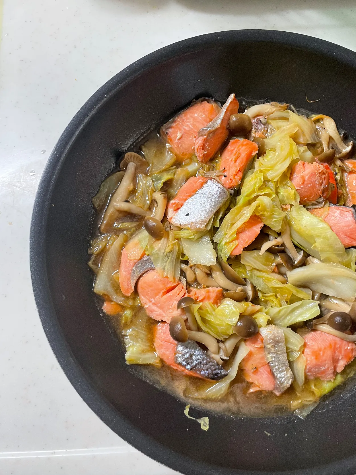 お昼兼朝ご飯🍚🥢鮭ハラスとシーフードの炊き込みご...