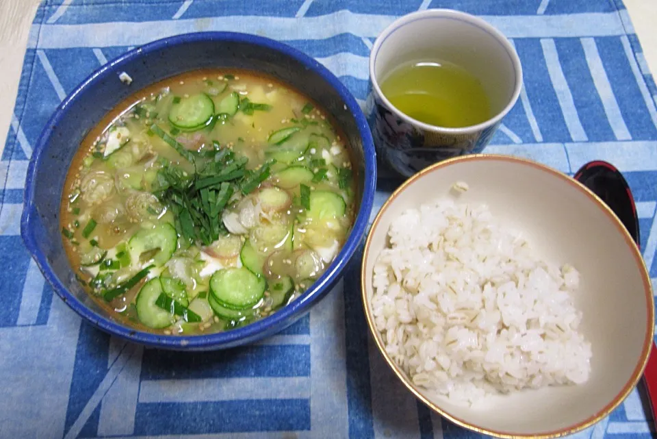20150901(火)朝食。冷汁。冷水で溶いてかけるだけの安物冷汁の素を買ってきて、豆腐、キュウリ、茗荷を加えて冷汁。やっぱ、価格三分の一だと味も…