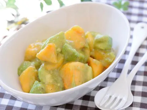 クリーミーなアボカドとやさしい甘味の柿の組み合わせがユニークなサラダ。「ヤマサごまだれ専科」のコクある風味がよく合います。