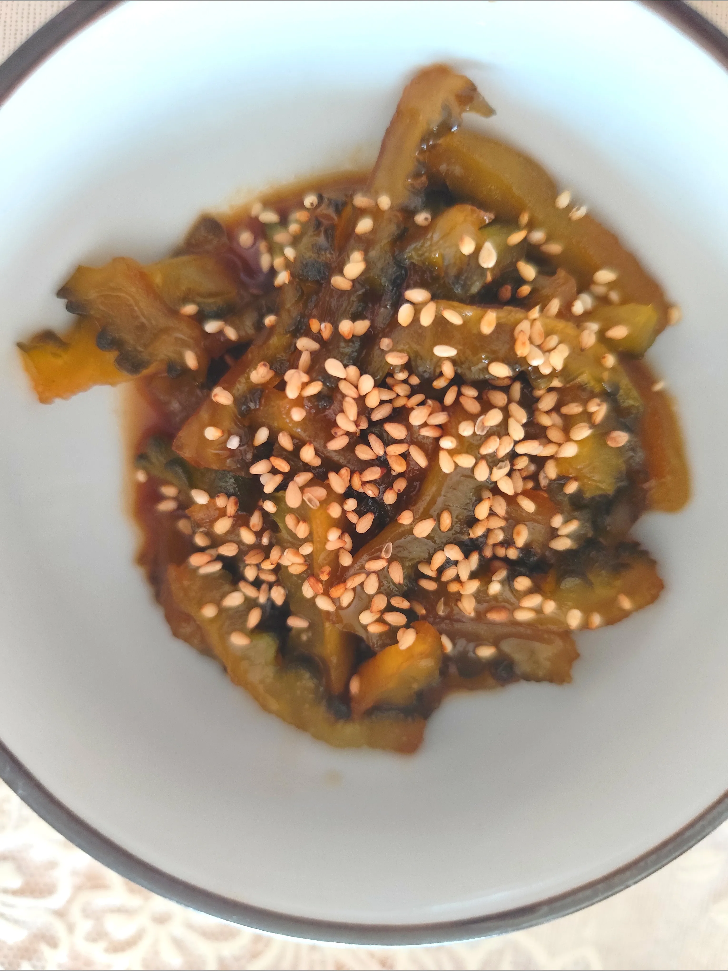 調味料とゴーヤーを一緒にグツグツしたかんじでしょうか〜?