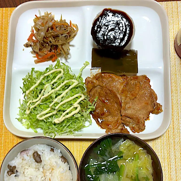 #晩ご飯 #焼く/炒め物 #肉料理 #キャベツの千切り #ふろふき大根 #きんぴらごぼう #白菜とほうれん草の味噌汁 #むかごご飯