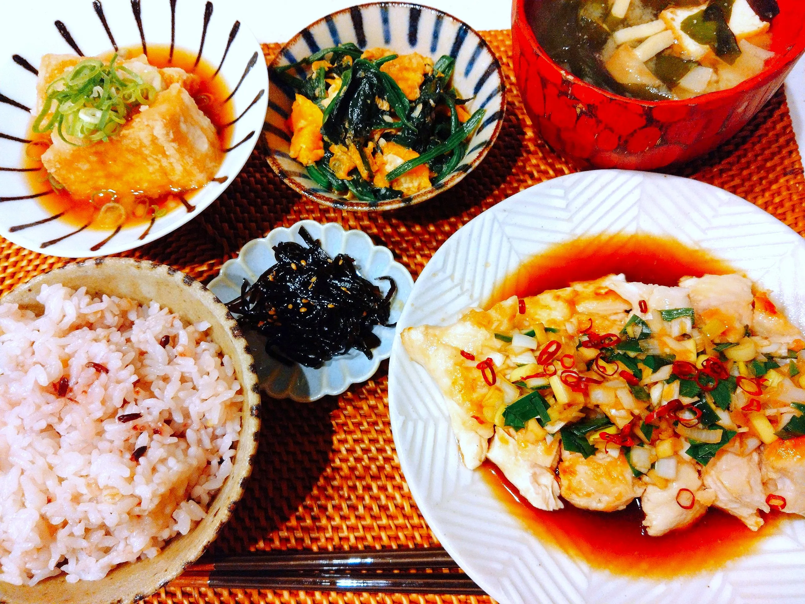 油淋鶏、ほうれん草と卵のオイスターソース炒め、揚出し豆腐、昆布、お味噌汁