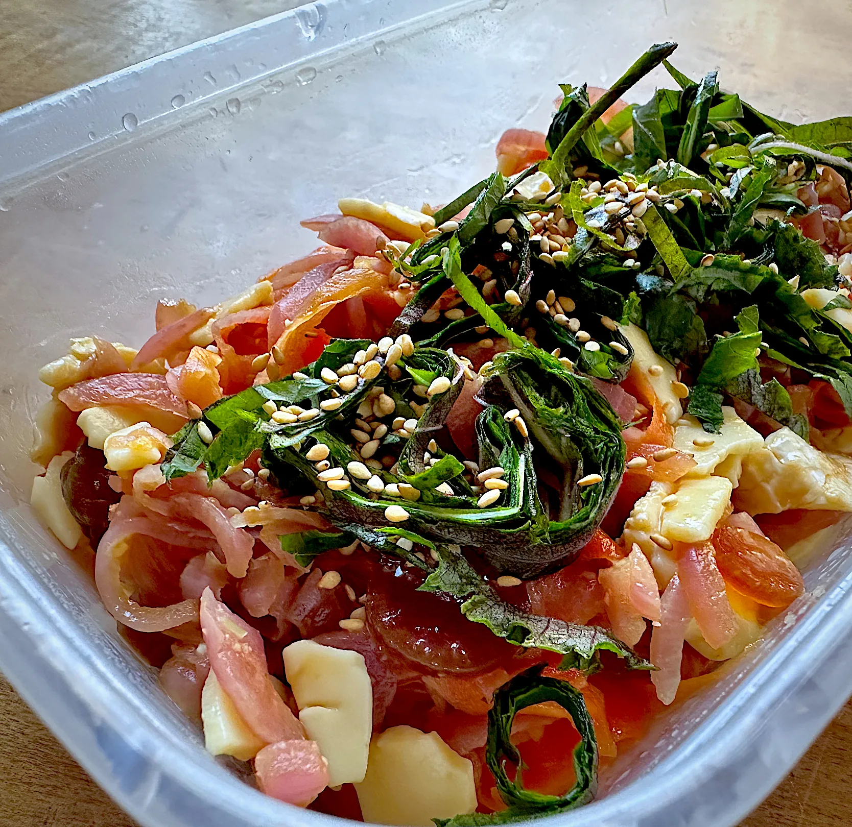 赤玉ねぎを酢漬けにしてたんだけど、食べ飽きてきたからアレンジを。にんじんをピーラーでひらひらにして、紫蘇、カマンベールチーズ、奈良漬、胡麻、そして赤玉ねぎの酢漬けに、醤油、オリーブオイル。酢、砂糖、塩、油があればドレッシングだよねって事で。赤玉ねぎの酢漬けで砂糖と酢が絶妙バランス。塩気は醤油、チーズ、奈良漬で単純な塩味でないのが良し!油はサラッとオリーブ油。アレンジバッチリ!