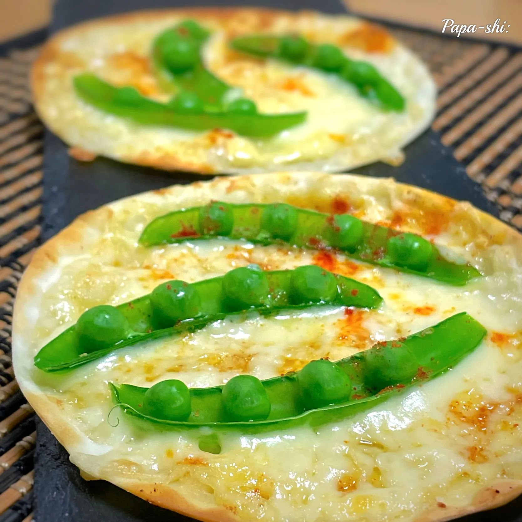 マヨ塗ってチーズ散らして茹でたスナップエンドウをトッピング、パプリカとチリペッパーをふって焼きました