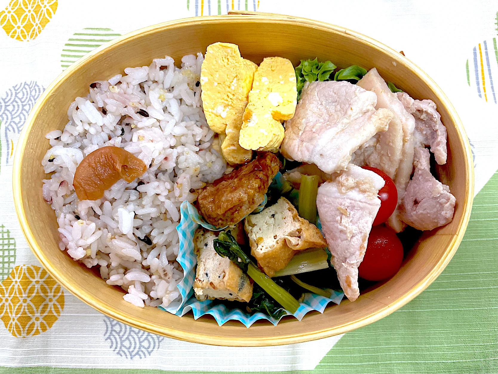 生姜焼き、玉子焼き、厚揚げ炒めの五穀米🍱