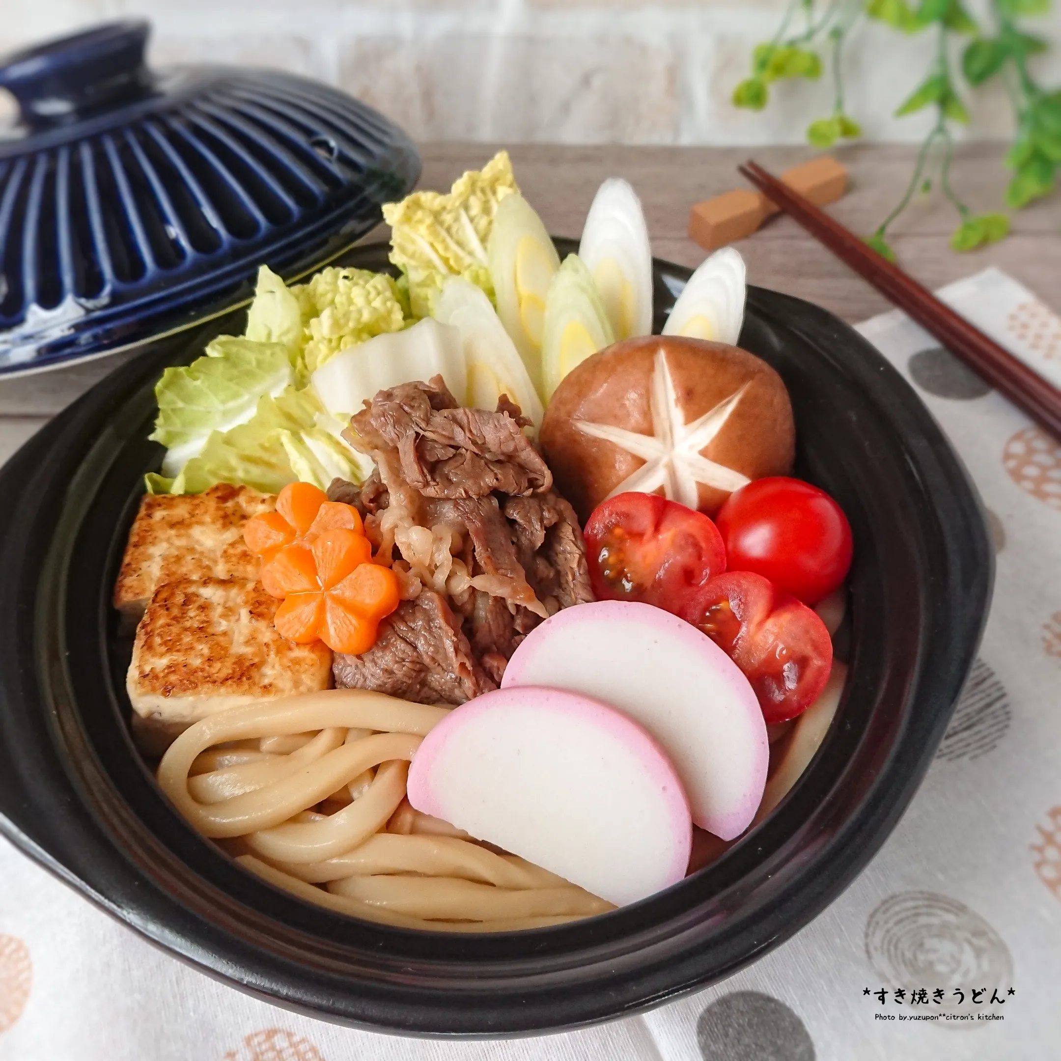 #うどん料理 #すき焼きうどん #鍋焼うどん #ミニトマト #焼き豆腐 #簡単料理 #卵不使用 #うどんの日(7月2日)