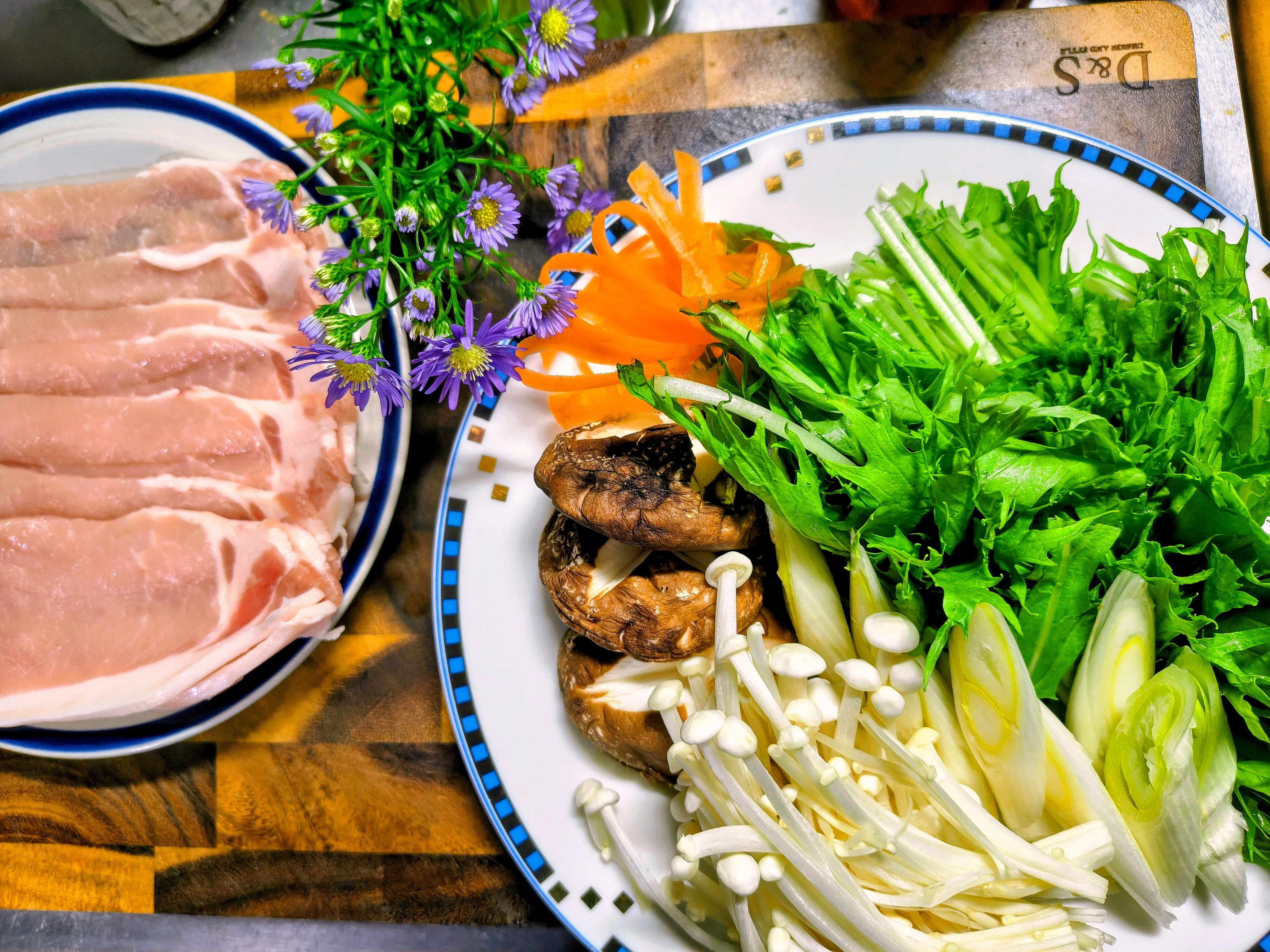 白だしでしゃぶしゃぶしました。豚ロース肉、水菜、椎茸、長ネギ、人参、えのきです。ポン酢しょうゆで食べました。冬は色んな鍋を食べたいです。🌼