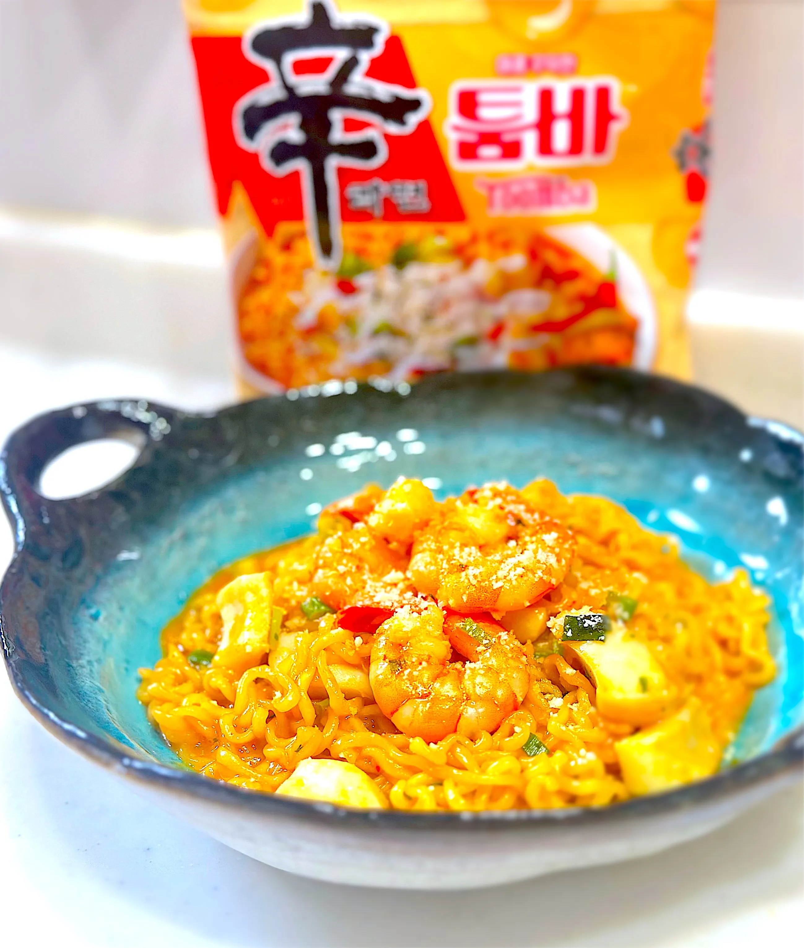 お馴染みの辛ラーメン🍜なんですが、カルボ風でクリーミー✨