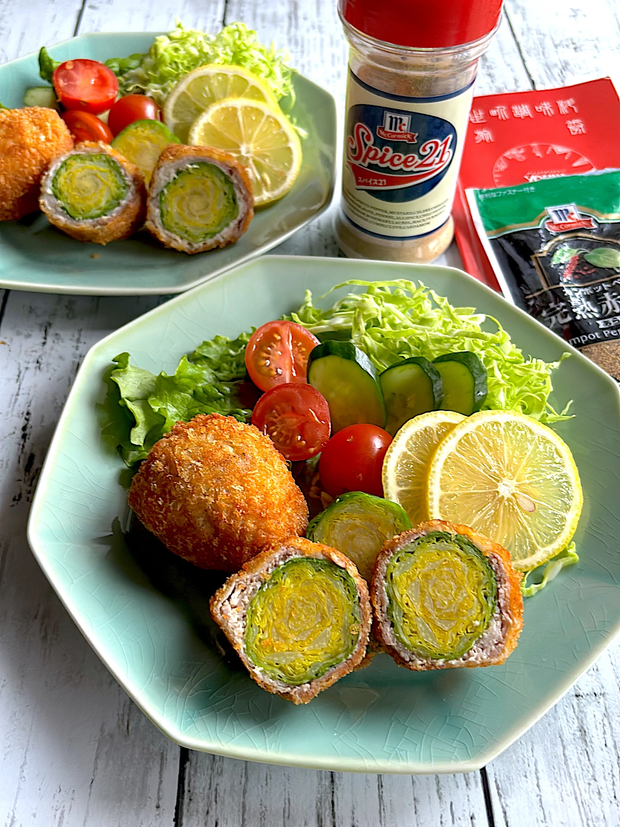 小粒ながら芽キャベツ丸ごとコロコロカツレツ。