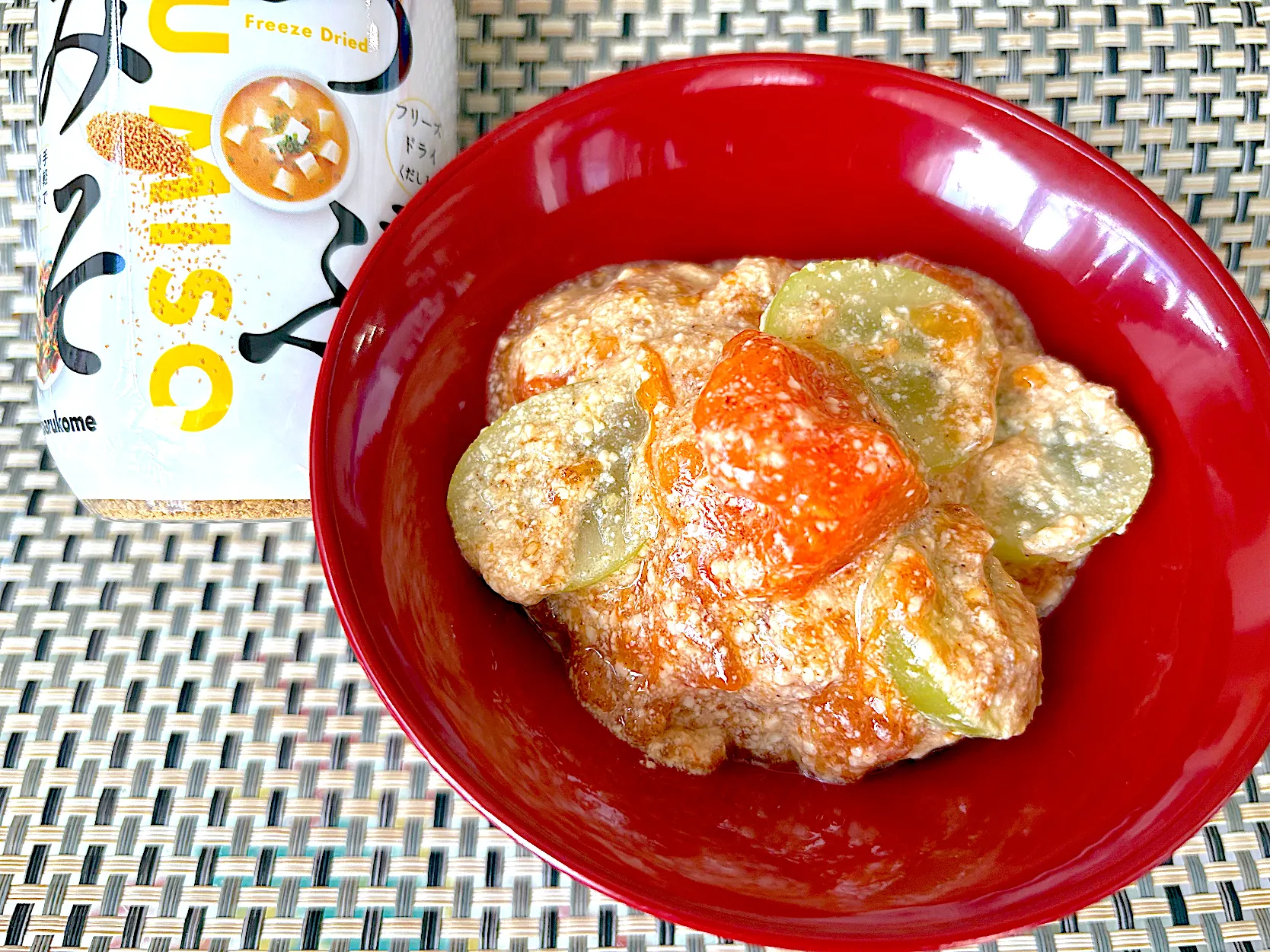 硬めの柿を買ったつもりが、熟しててトロトロでした。ちょっと色は濃いですが、白和えです。