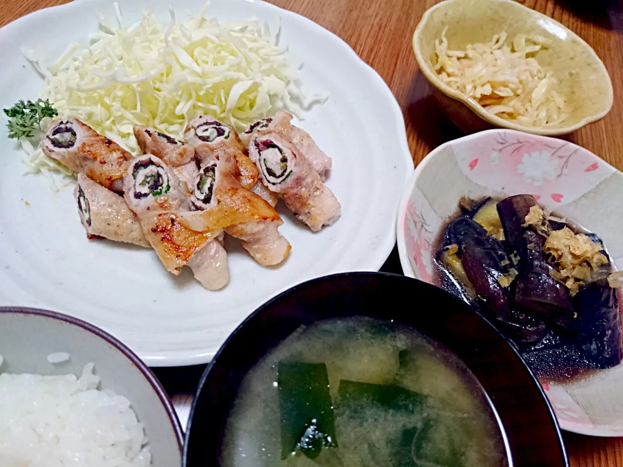 ・豚肉の梅しそ巻 ・ナスの煮びたし ・切り干し大根とキャベツの酢の物 ・葱とワカメの味噌汁