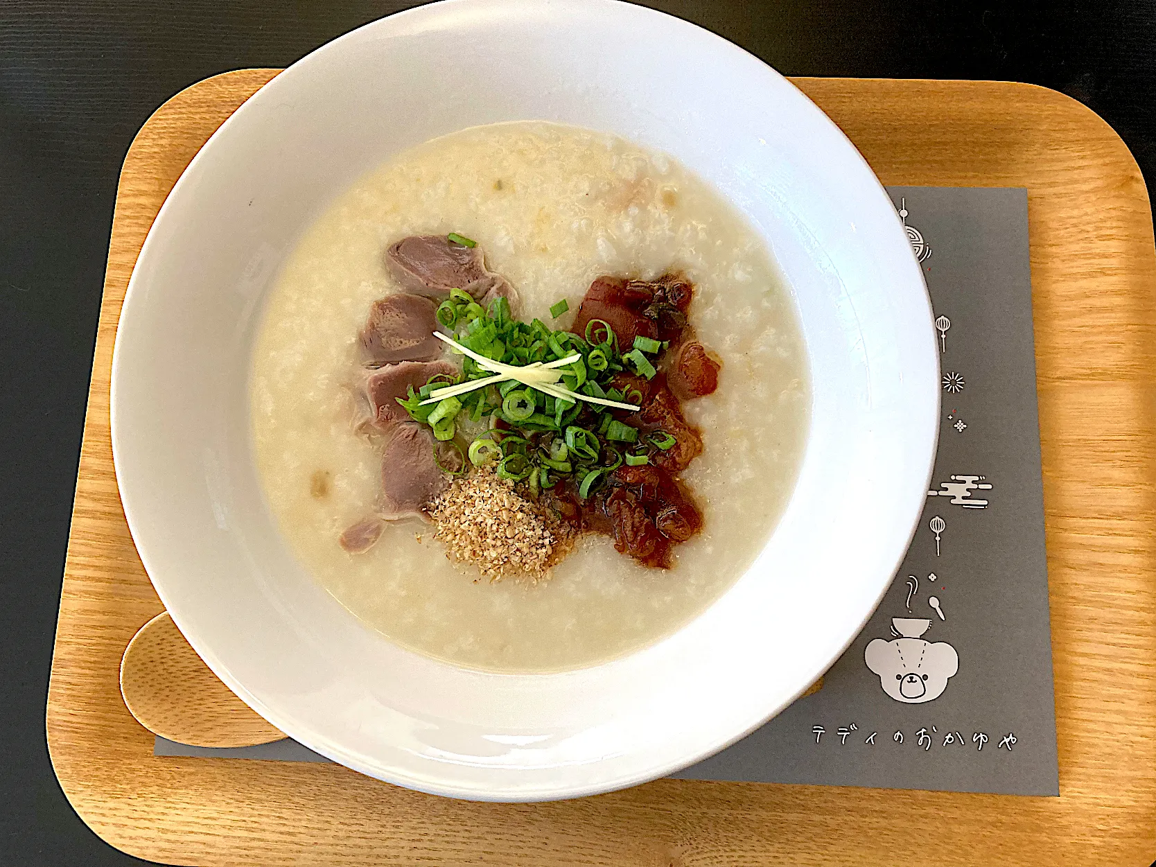 基本のお粥に特製砂肝コンフィと豚足の2種の具と、塩レモンをトッピングしてみました🎵