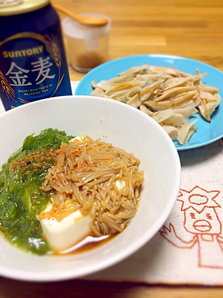 冷奴に自家製なめことメカブをかけまして簡単おつまみ〜(o⁰⊖⁰o)♡