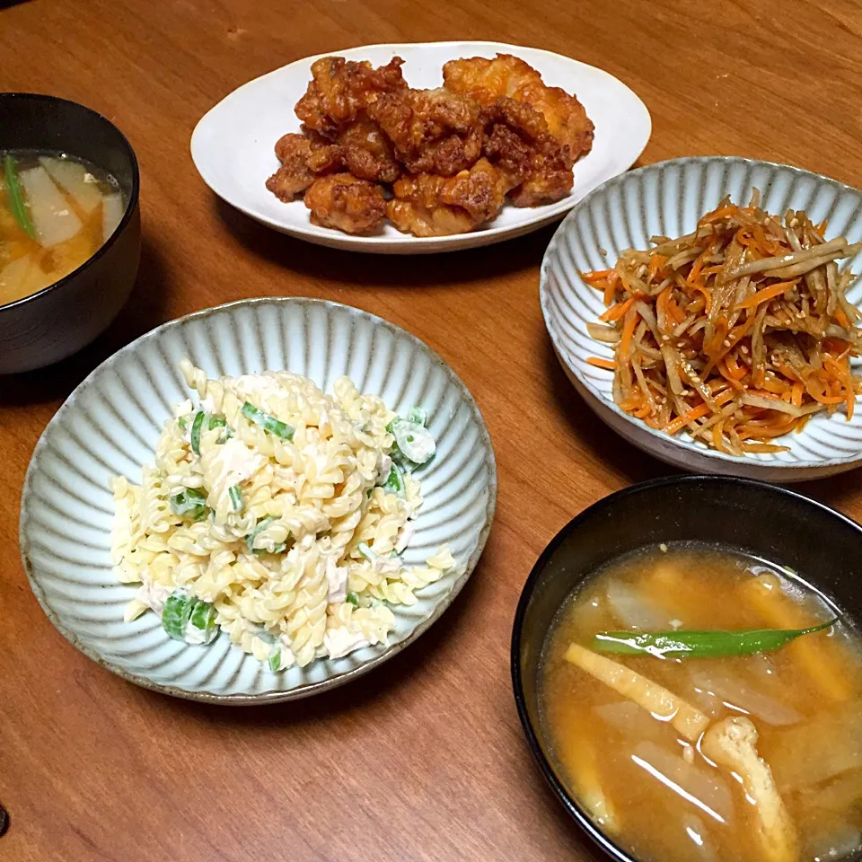 お弁当屋さんの唐揚げ、マカロニサラダ、きんぴらごぼう、大根とインゲンと油揚げのお味噌汁
