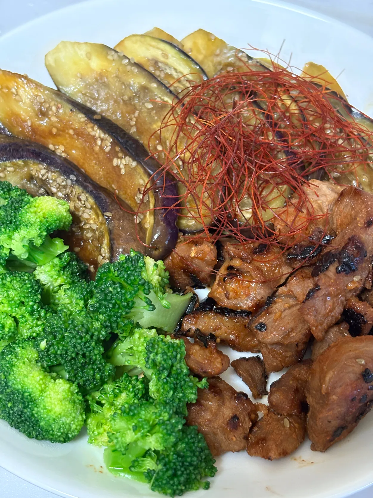 ナス🍆とカシラを甘辛焼きにしました🥰